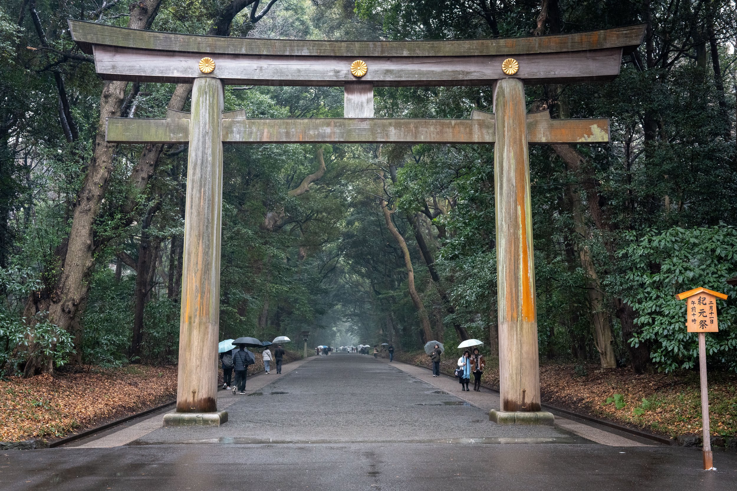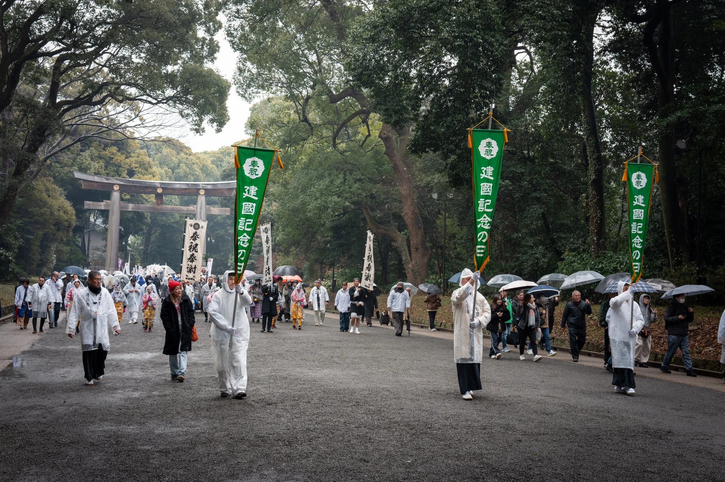 Today was a national holiday (National Foundation Day (建国記念の日)—marking a celebration of the day the first emperor of Japan (Emperor Jimmu) ascended to the throne in 660 BC. Because I love soaking up Japanese culture, I researched activities happening in and around Tokyo for the holiday. I found an annual parade at the Meiji Jingu shrine scheduled for 10:00am, so I grabbed my camera, put on my rain gear (it was raining this morning), and headed to the shrine.